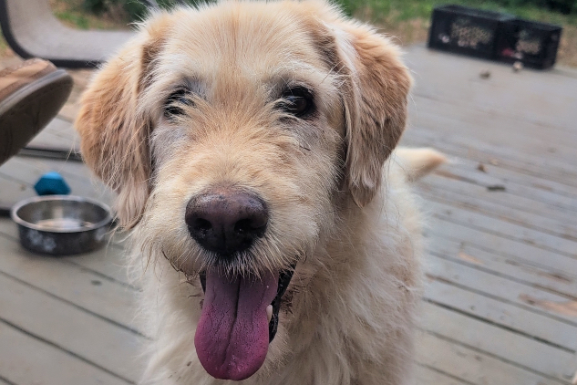 Hi, I’m Daisy. I’m a Golden Doodle mix. I’m blonde/tan. I could be 9-11 years old, I guess that makes me a “senior”!!! Well, I’m a spunky senior. I still have a lot of energy.