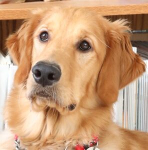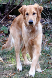 AL (24-057) is a happy, healthy, handsome, curious golden, with the boisterous rambunctiousness and energy level of a 10-month-old puppy on permanent display. “Cute” is his superpower! Al gets along well with everyone and everything, although cats are an unknown. He is extremely high-energy, and will chase a ball, a squirrel, or a rabbit with equal gusto, so a fenced yard is important. He may be too energetic for a household with small children. Al loves meeting people and will take you on a brisk “walk” so he can meet the neighbors and their dogs. Unfortunately, he gets carsick, and does not do well on long drives, although we hope he may outgrow this. Al is finding his way around basic obedience commands.