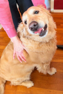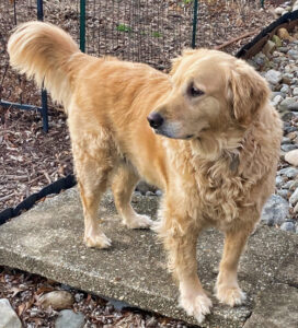 TAYLOR (26-004) If Taylor could write a want ad, it might sound something like this: “Homebody canine looking for same in human companion. Lots of love to give.” Love bug Taylor is a sweet 5-year old Golden who enjoys cuddling and being near her humans. In general, she is low activity and more of a couch potato than your typical Golden. Her rotund figure (she weighed in at 87 lbs) may be due to a sedentary lifestyle. Time will tell, as Taylor has already begun a weight management journey necessary for a healthy future. Taylor is very smart, eager to learn and highly treat-motivated. She knows “sit” and likely other commands. She is housebroken and communicates when she needs to go out. Taylor stays off of the furniture, and sleeps on a dog bed. She travels well in a car. Taylor finds the world outside of the front door to be a scary place and is on alert when she sees or hears vehicles or people on or near the property. Usually she simply growls, but sometimes the situation warrants some barking, in her opinion.